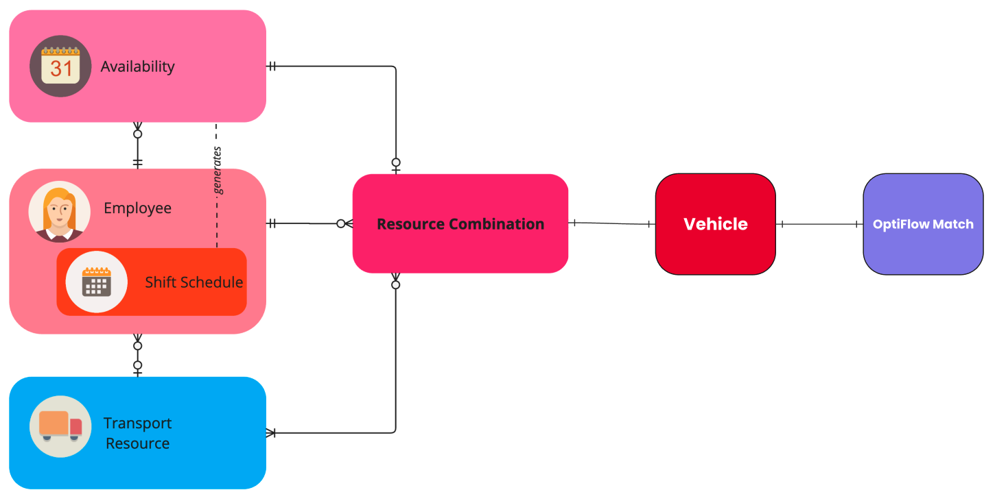 Resource Combinations can not be directly managed by end-users or integrations. They are the domain entity which results from combining an available Employee with one or more suitable Transport Resources. The Resource Combination is the entity which is used by the optimization engine. It aggregates all skills and capabilities of its constituent parts, as well as their costs. A Resource Combination has a deployability, derived from the Employee's Availability. The deployability is impacted by external factors such as preceding or following shifts, Transport Resource availability, and so on.